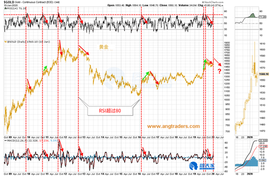 黄金的RSI指标再次突破80。过去七次这种情况发生后,有五次金价在接下来的数月里下跌。