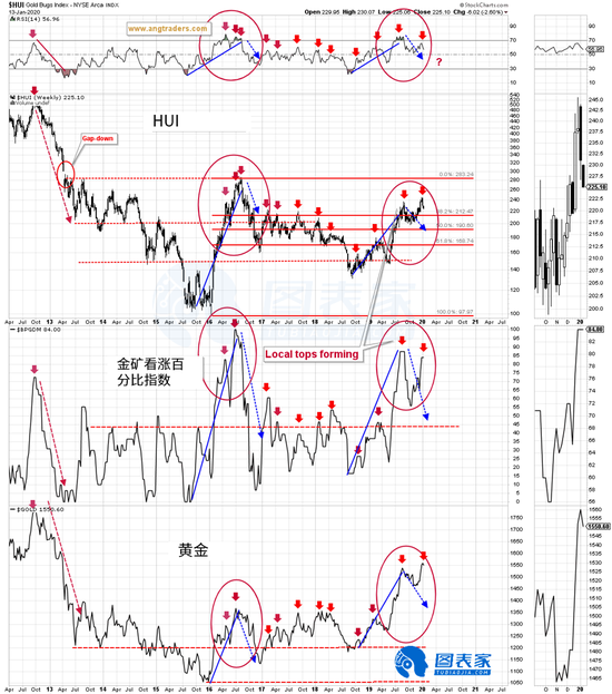 金甲虫指数(HUI)和金矿看涨百分比指数已经偏离了2016年的走势,但此时这种模式仍然是可以恢复的。