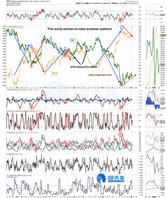 正如2016年那样,黄金与ProShares两倍做空20年期以上美国国债ETF(TBT)“初冬至夏末”的负相关性依然有效。TBT逐步走高并形成低点上移,即使金价因地缘政治担忧而飙升。