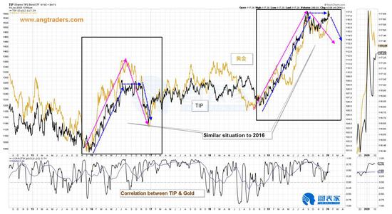美国通胀保值债券(TIP)与黄金继续保持正相关,一如2016年。若这种模式再次上演,将预示金价下跌。