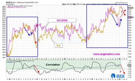 2016年10月,当海外逆回购首次开始上升时,金价随之上涨,但到11月,当逆回购再次增加时,金价持续下跌,二者变成负相关性。这一次这种情况是否会再次发生尚不确定,但重复这种模式无疑是有可能的。另一种可能的情况是,逆回购再次减少,金价保持与它的正相关性,随之走低。