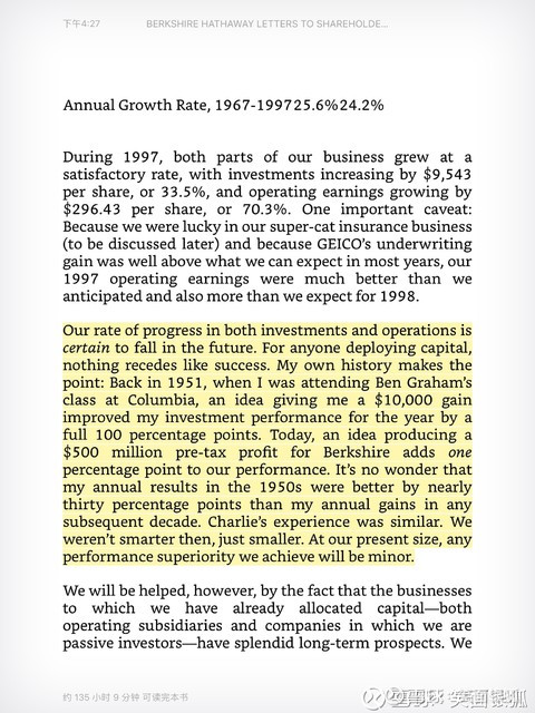 1、巴菲特的长期收益率是年复利20%,所以我们这些做价值投资的小散户对收益率的预期应该低一些。但是很多人不知道巴菲特年轻的时候资金体量小,年化收益率是有50%这么高的。巴菲特现在资金体量大了,不能灵活的买进卖出,所以收益率下来了。以下截图为我购买的kindle电子书。我是纸质版和电子版混着看。