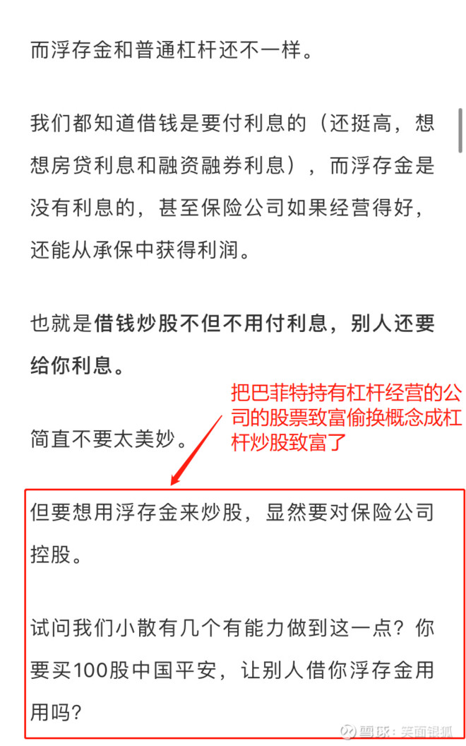 6、有人说巴菲特这么有钱是因为他可以用保险公司的浮存金来炒股,这完全是偷换概念。巴菲特这么有钱是因为他长期满仓大牛股伯克希尔(这是一家杠杠经营的企业),又不是挪用保险公司的浮存金作为杠杆给自己买伯克希尔的股票。持有一家杠杆经营的企业的股票致富跟杠杆炒股致富是两码事。你可以说伯克希尔杠杆炒股,但是不能说巴菲特杠杆炒股。