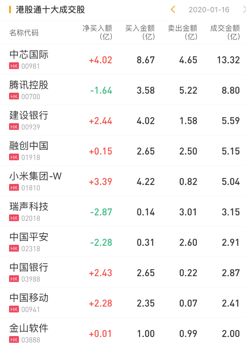 港股通资金今日净流入港股21.04亿港元。今日净买入中芯国际4.02亿港元,净买入建设银行2.44亿港元,净买入小米集团3.39亿港元。