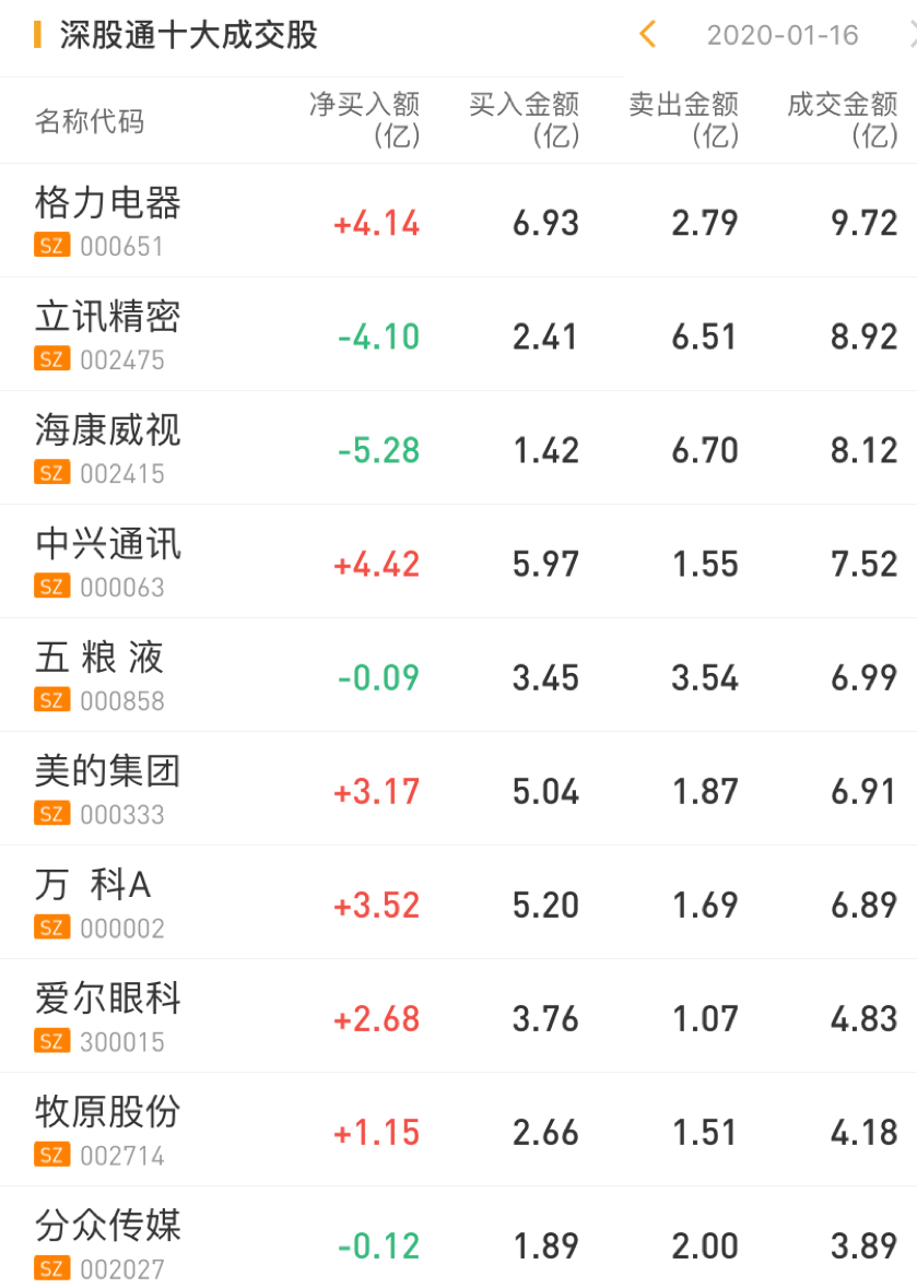深股通净买入格力电器4.14亿元,净买入中兴通讯4.42亿元,净买入美的集团3.17亿元;净卖出立讯精密4.10亿元。