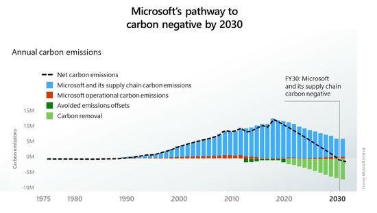 微软还承诺到2030年实现“负排放”,并且到2050年将清除足够的碳排放,以弥补微软成立以来的排放量和电力消耗。