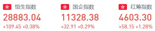 港股恒指周四尾盘拉升,截至收盘,恒指涨0.38%,报28883.04点,大市成交1015亿港元。红筹指数涨1.28%,国企指数涨0.29%。