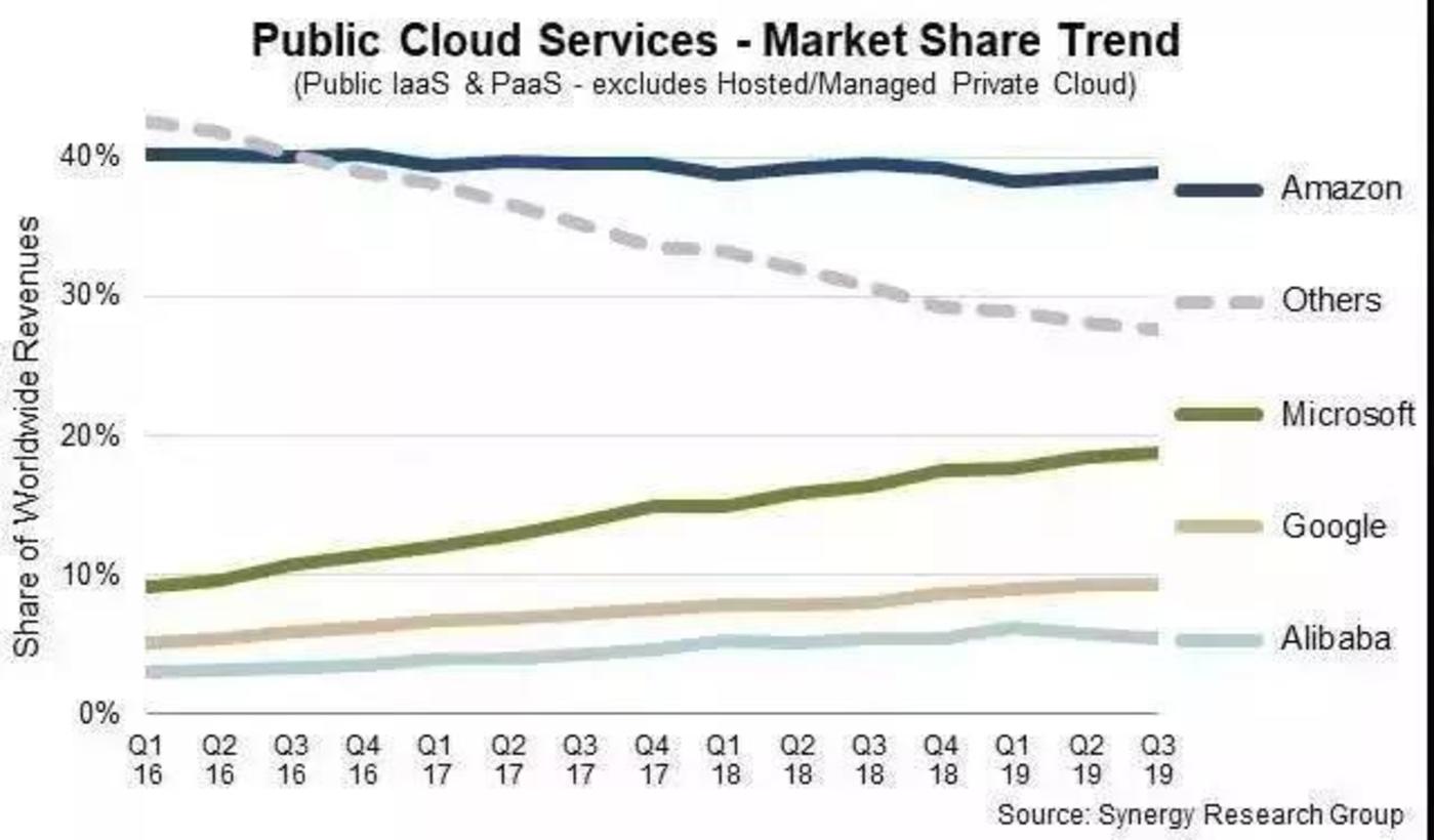 而据研究公司Canalys的数据显示,截止2018年第三季度,亚马逊云服务AWS占全球云计算支出的近33%,微软占近17%,谷歌占不到7%。