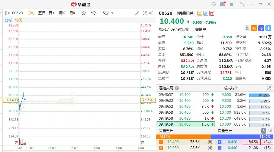 新浪港股讯 1月16日消息,呷哺呷哺一度跳水逾14%,现跌7.96%,报10.4港元,此前网传股东折价售股套现最多8亿港元。
