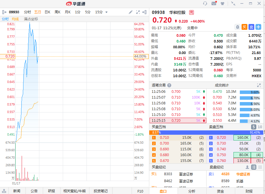 华盛资讯1月17日讯,首日挂牌的华和控股低开高走,临近午盘截止11:29涨44%,成交额6448万港元,最新市值7.2亿港元。此前暗盘收跌2%。