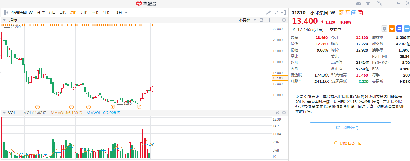 1月17日,小米集团一度大涨超过9%,股价最高冲上13.46港元。这也是小米从2018年12月以来,时隔一年时间又站上3200亿港元市值。
