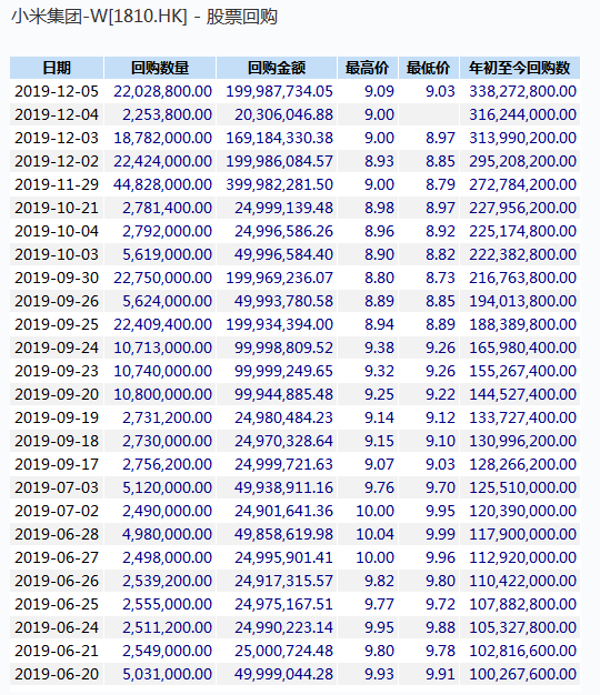 在2019年全年小米累计回购股份约3.38亿股,回购金额超过30亿港元。单计9月份以来,小米共动用了不到20亿回购,简单计算未来小米仍有百亿回购计划待完成。