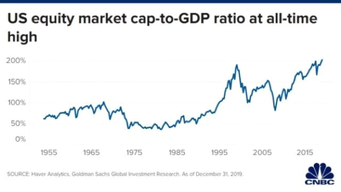 上周,高盛发布的一份研究报告显示,美股当前的股市市值/GDP比率已突破200%,已经超过1999年互联网泡沫时期达到了历史最高水平。高盛分析师对此表示,美股标普500指数在过去一年中已经上涨近30%,而2020年在不到15天内又上涨了1%,目前的美股以历史衡量标准正在变得越来越昂贵。