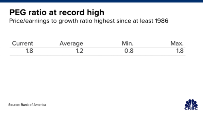 近期,美国银行数据显示,目前市场的PEG水平为1.8,是美银自1986年开始跟踪这一比率以来的最高水平;市盈率为18.4倍,达到2002年以来的最高水平。PEG指标显示,与长期收益增长预期相比,投资者愿意为股票支付的价格处于历史最高水平。