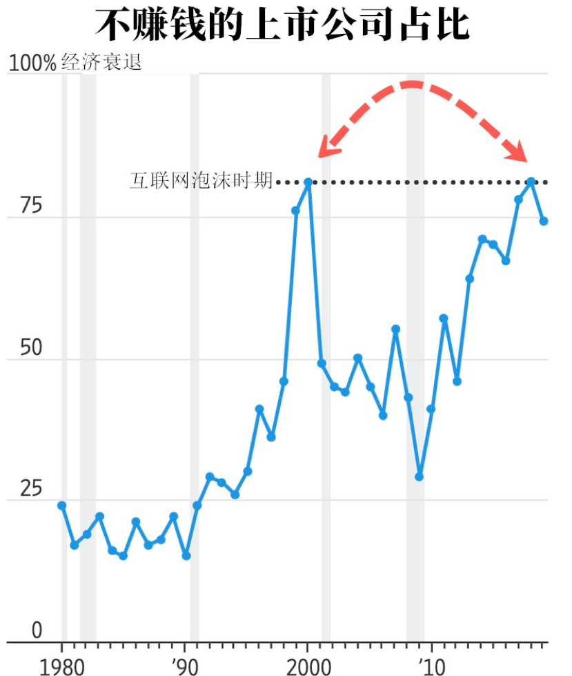 外媒指出,在过去的12个月中,所有在美上市的企业有40%处于亏损状态,上次达到这一比例还是1999年互联网泡沫时期。下图为美国福罗里达大学金融学教授Jay·Ritter提供的数据,显示2018年美国亏损的IPO比例占比已经超过75%,相当于1999年互联网泡沫时期。