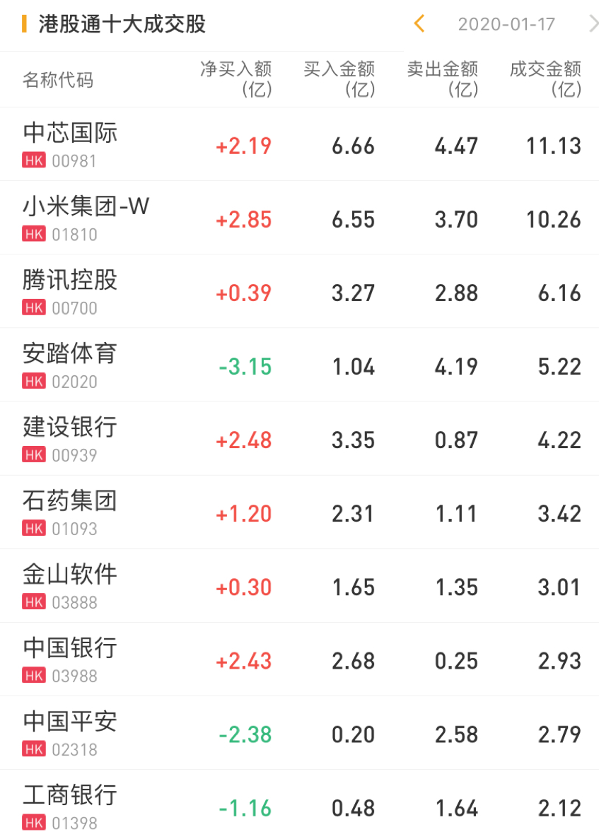 港股通资金今日净流入港股21.70亿港元。今日净买入中芯国际2.19亿港元,净买入建设银行2.48亿港元,净买入小米集团2.85亿港元。