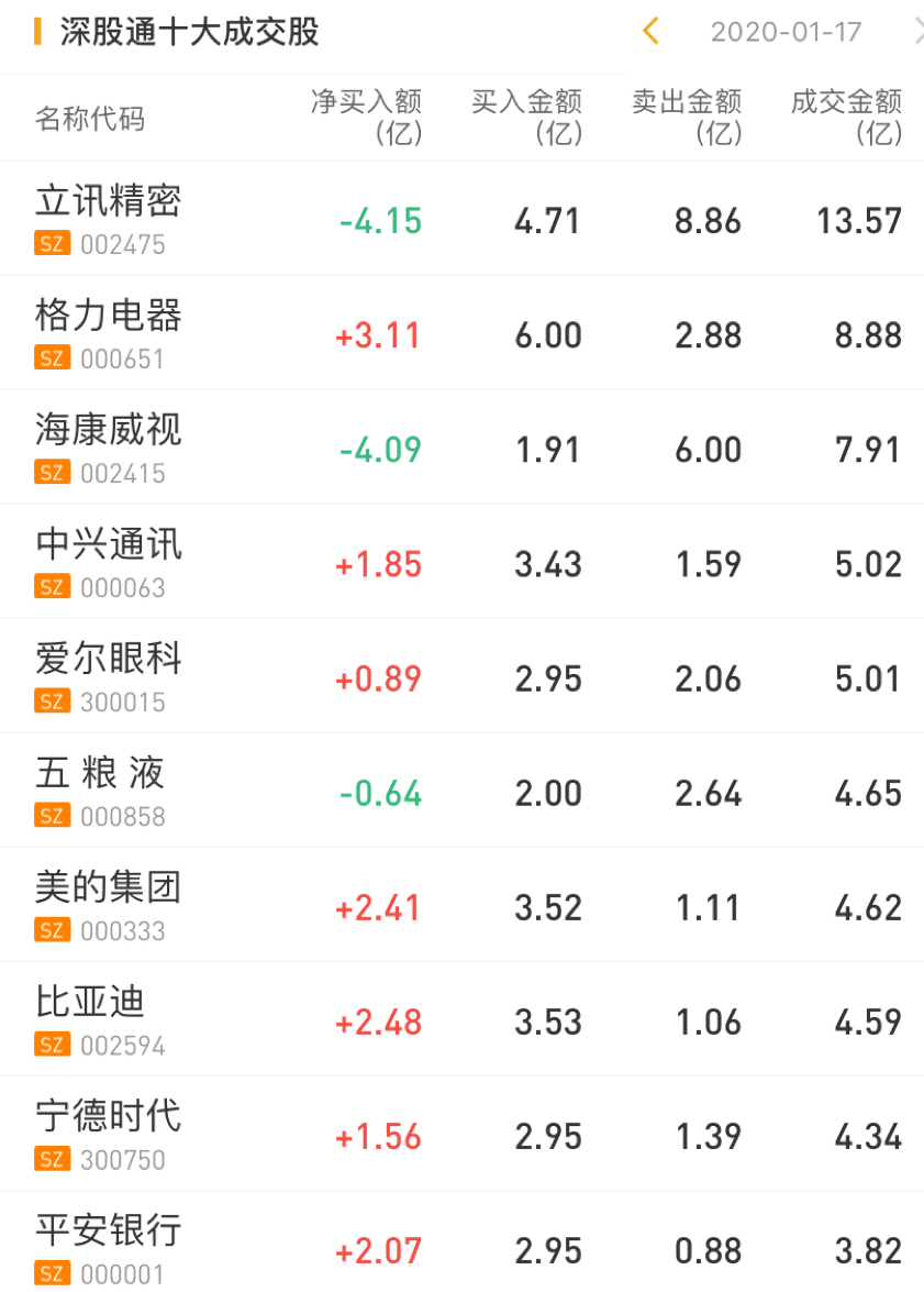 深股通净买入格力电器3.11亿元,净买入中兴通讯1.85亿元,净买入美的集团2.41亿元;净卖出立讯精密4.15亿元。