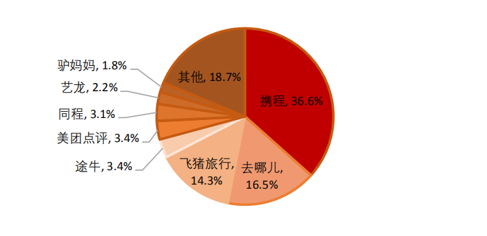 国内的旅游市场竞争激烈,一超多强格局稳定,龙头整合行业资源。份额最大的是携程和去哪儿,接下来是飞猪等其它一些App。