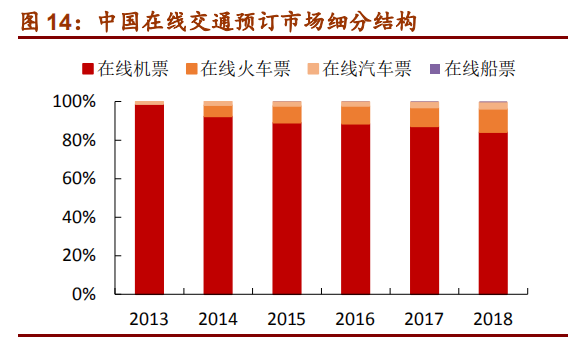 在线票务预定中,机票占比最高,为兵家必争之地。携程为第一大平台,飞猪市场份额逐渐增长。火车票占据在线交通第二大领域,汽车票和船票在线销售比例低。火车票近年也在逐渐增加占比,这些平台代销火车票并无佣金,主要以获取庞大的流量基础,以及配送、贵宾休息室、保险销售等增值服务的利润为目的。