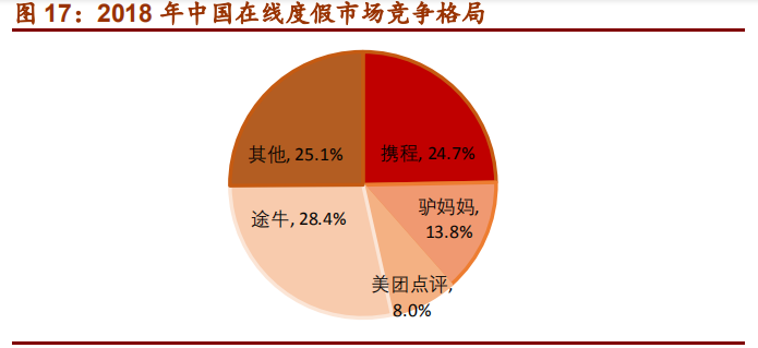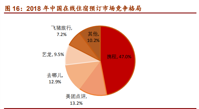 携程系(含去哪儿)凭借高端酒店优势和较强的用户粘性占据 59.9%的市场份额,保持绝对竞争优势,美团点评专注于低线市场,占据 13.2%的市场份额,同程艺龙则借助微信引流,以 9.5%的份额位列第三。所以定酒店而言,携程系、美团、同程艺龙是大多数人的选择。