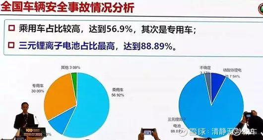 2019世界新能源汽车大会上,国家市场监督管理总局质量发展局副局长王赟松的演讲。据他介绍,2019年3月18日到7月1日,国内发生了几十起新能源汽车起火事故。全国新能源汽车安全事故中,乘用车和专用车的比例分别为56.92%和30%;三元锂电池和磷酸铁锂电池的比例分别为88.89%和7.94%,还有3.17%的事故无法确定电池类型。