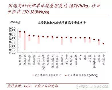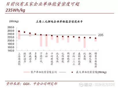就目前的如下图的数据来看,磷酸铁锂电池单体能量密度中枢在170-180Wh/kg之间,而三元锂电池单体能量密度中枢在220-230Wh/kg之间,其中超过235Wh/kg就有5家。