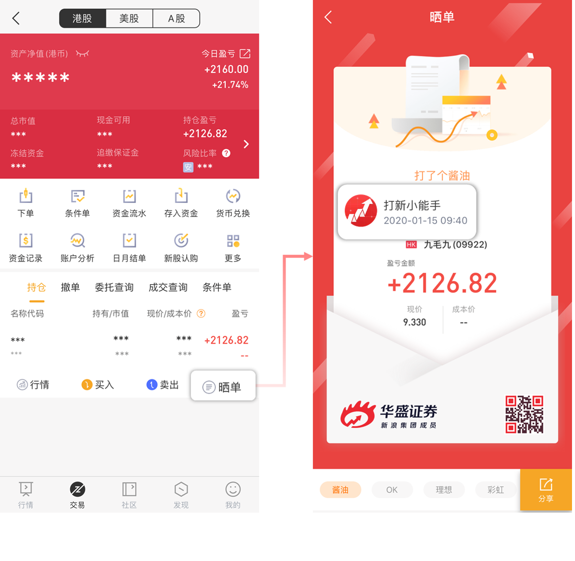 新版华盛通中,无论你是想要分享“今日盈亏”,还是“个股盈亏”,或者“IPO盈亏”,在晒单生成图片的时候,都会为你自动加上昵称和头像哦,让分享的时候更有面儿。