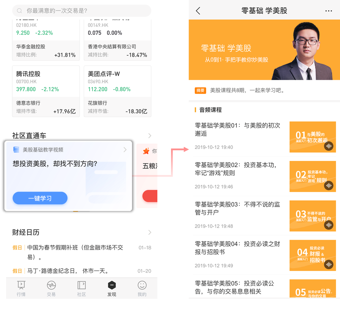 华盛通“发现”版面的社区直通车栏目,包含了猜涨跌、智能推荐资讯、社区圈子、财报预告等多个直通卡片,点击即可进入相关功能。新版中增加了“课程直通卡”,点击就能开启港美股学习之路,投资的同时,还能精进自身技能。