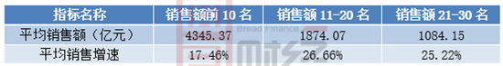 如果进一步把TOP30上市房企按照销售额分成三组,可以看到销售额排名前10组的平均销售增速明显慢于其他两组。