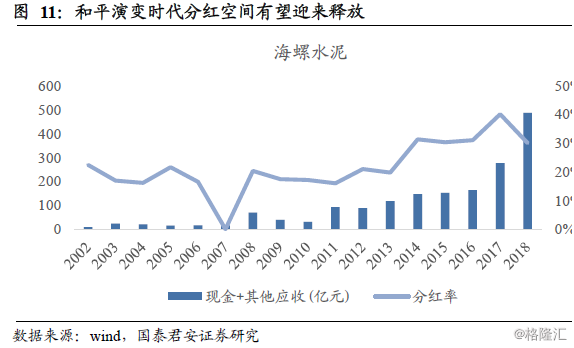 “和平演变”时期下,分红提升或将成为现实。当未来行业“和平演变”的趋势日益被确认,行业龙头分红率也将有机会迎来上升。目前龙头水泥公司账面仍留有较多资金,或主要为未来可能的价格战与战略收并购做充分准备,相当于在进行“军备竞赛”,而未来“和平演变”的趋势真正明朗,更进一步的现金储备必要性将大幅降低,海螺水泥等龙头水泥公司分红空间或有望迎来释放。