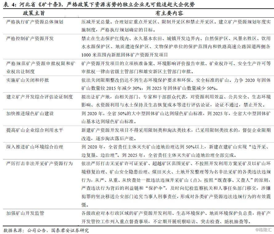目前京津冀内独立企业外购石灰石的最低成本已然不低,而在部分来源灰色和运输趋严的环境下,一些独立企业成本的进一步提升其实一触即发。目前对于自有矿山开采,河北省已经出台“矿十条”等较为严格的指导政策,独立企业现在醒悟追赶大企业已然无望,未来一旦对矿石外购来源,私挖滥采,矿石运输等问题进一步严格政策指导并执法,或将更快速提升独立企业成本。金隅冀东等大企业或有机会发挥优势。