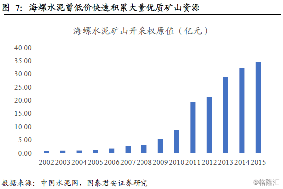 其中海螺水泥最具代表性。出身于石灰石储备最丰富的安徽是其先天优势所在。在从华东起家并向华南西南进一步扩张时,其以长远的眼光大量储备优质石灰石矿山资源。