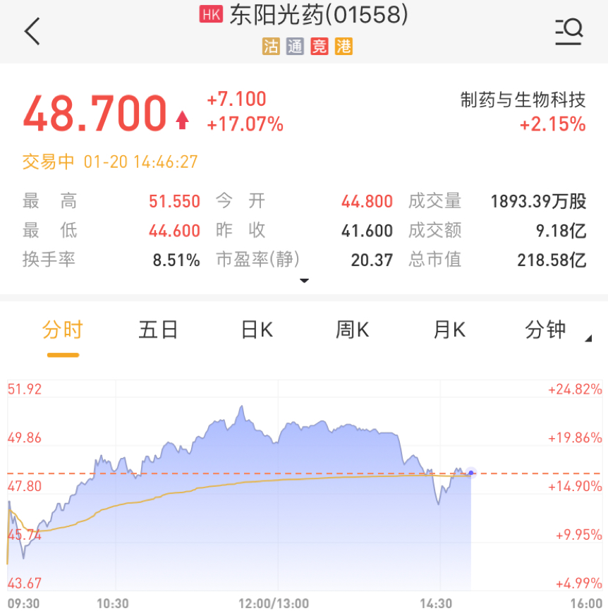 在流感威胁的隐忧下,资本市场已有多只流感概念股表现强势,本文即准备介绍一只在港股上市的纯正流感预防概念股—东阳光药(01558)。截至发稿,东阳光药大幅上涨17.07%,现报48.70港元每股,当前总市值为218.58亿港元。