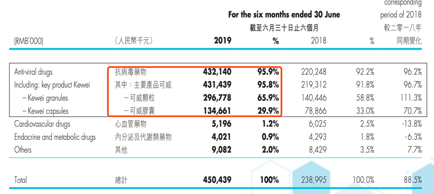根据东阳光药发布的中期财务报告,2019H1可威系列产品(包括颗粒和胶囊)占当期营收比重达到95.8%;2018FY,可威系列产品占公司全年营收比重91.8%。整体而言,可以说东阳光药的核心业务就是防治流感的可威系列产品。