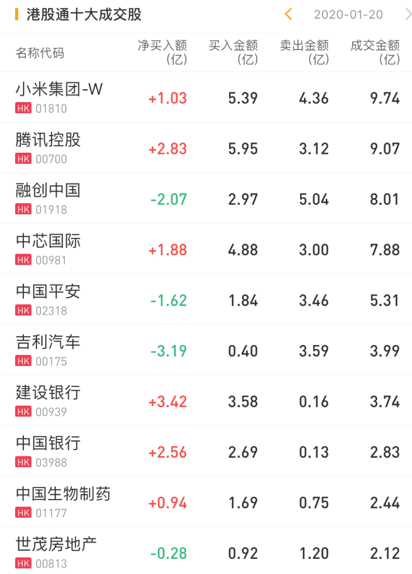 港股通资金今日净流入港股16.82亿港元。今日净买入腾讯控股2.83亿港元,净买入小米集团1.03亿港元,净买入中芯国际1.88亿港元。