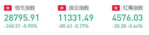 恒指周一高开低走,早盘曾高开112.7点或0.39%,报29169.12点。截至收盘,恒生指数跌260.51点或0.9%,报28795.91点,全日成交额达1115.99亿。国企指数跌0.77%,报11331.49点,红筹指数跌0.44%,报4576.03点。
