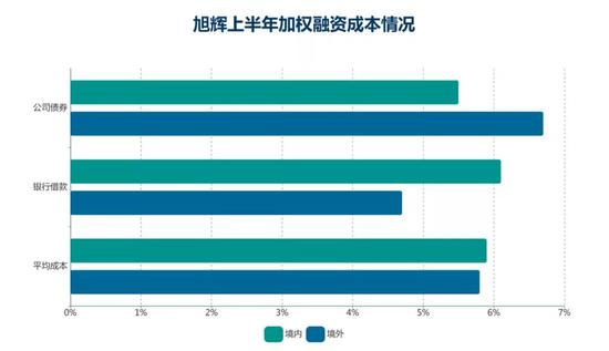 至于为何偏爱外债?除了发行难度相对较低外,与境内相比略低的融资成本同样也是吸引旭辉的主要因素。从上半年融资数据来看,旭辉境外平均加权融资成本为5.8%,略低于境内。