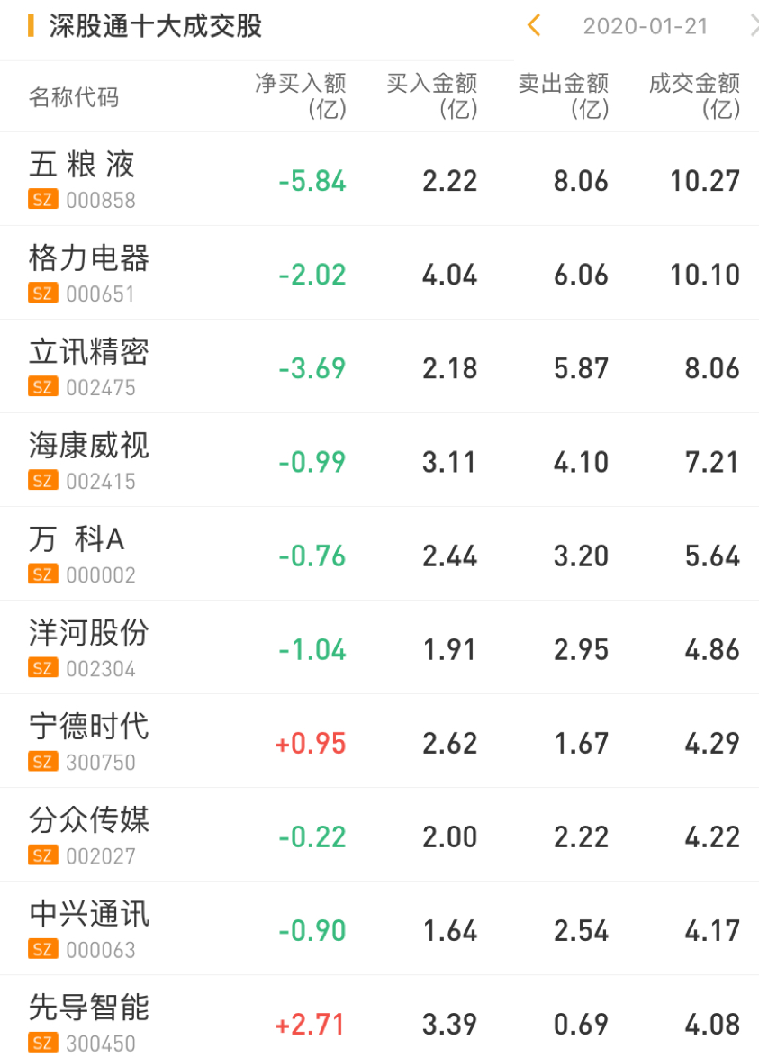 深股通净卖出五粮液5.84亿元,净卖出立讯精密3.69亿元,净卖出格力电器2.02亿元。