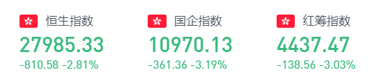 恒生指数开盘跌1.2%,全天单边下跌。截至收盘,恒生指数跌810.58点或2.81%,报27985.33点,全日成交额达1328.4亿。国企指数跌3.19%,报10970.13点,红筹指数跌3.19%,报4437.47点。