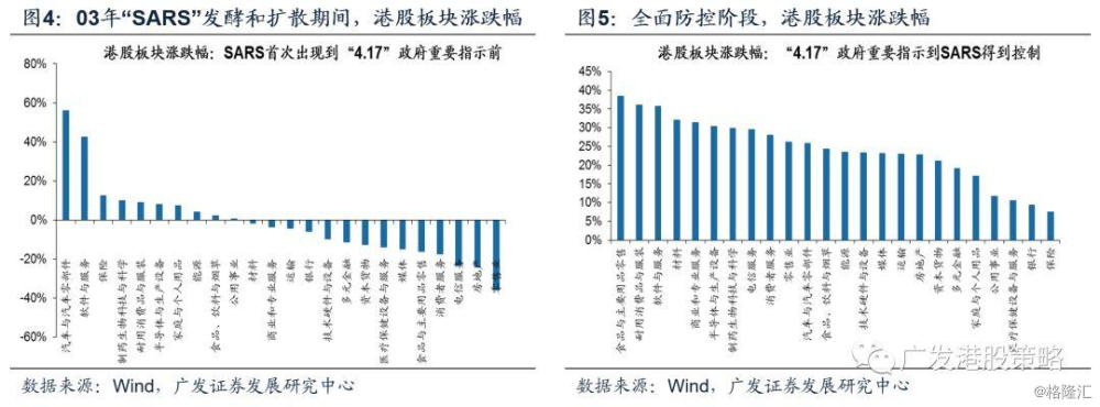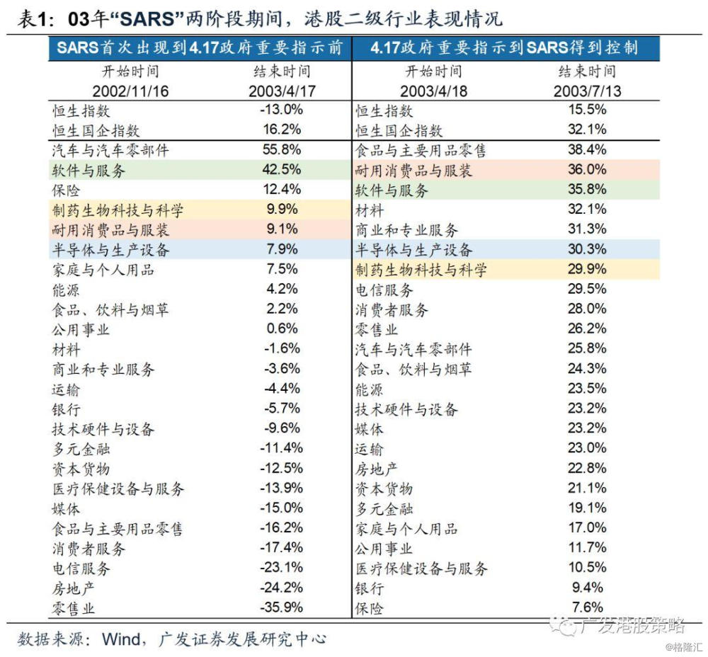 3.关于行业影响,03年“SARS”疫情发酵和扩散期间,港股零售、地产、消费者服务、食品、媒体等板块明显下跌,而全面防控阶段这些板块均全面反弹;部分板块在整个疫情期间几乎不受影响,如软件与服务、生物制药、耐用消费品及服装、半导体等。