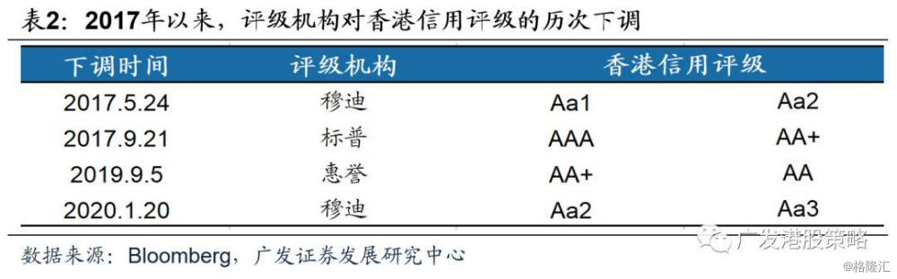事实上,这并非穆迪首次下调香港长期信用评级,早在2017年5月24日就从Aa1下调至Aa2。穆迪本次下调的理由基于过去9个月的政治、经济和社会问题,但在香港社会事件边际好转的走向下,不应静态看待过去的问题,我们认为投资者对于本地因素的预期仍有修复的空间;另外,考虑到穆迪同时将评级展望从负面上调为稳定,反映出香港较强的财政实力及金融市场稳定性。