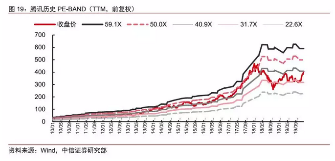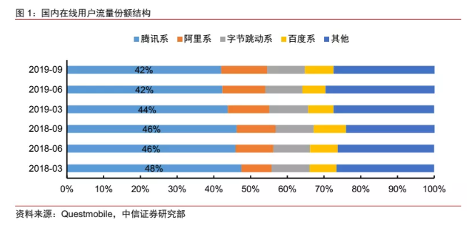 其中,用户平台上,根据Questmobile数据,经历前期持续下滑后,腾讯国内在线用户流量份额自2019Q2开始明显企稳,Q2、Q3连续两个季度维持在42%左右。