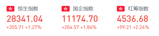 周三,恒生指数开盘涨131.17点,盘初一度跳水,随后持续震荡上涨。截至收盘,恒生指数涨355.71点或1.27%,报点,全日成交额达28341.04亿。国企指数涨1.86%,报11174.7点,红筹指数涨2.24%,报4536.68点。
