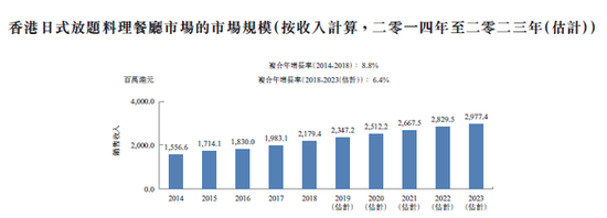 在2014-2018年,日式放题料理餐厅市场的收入按约8.8%的复合年增长率,由1556.6百万港元增加至2179.4百万港元,预期将以6.4%的复合年增长率增至2023年的2977.4百万港元,增速高于同期香港餐饮的整体增速3.3%。