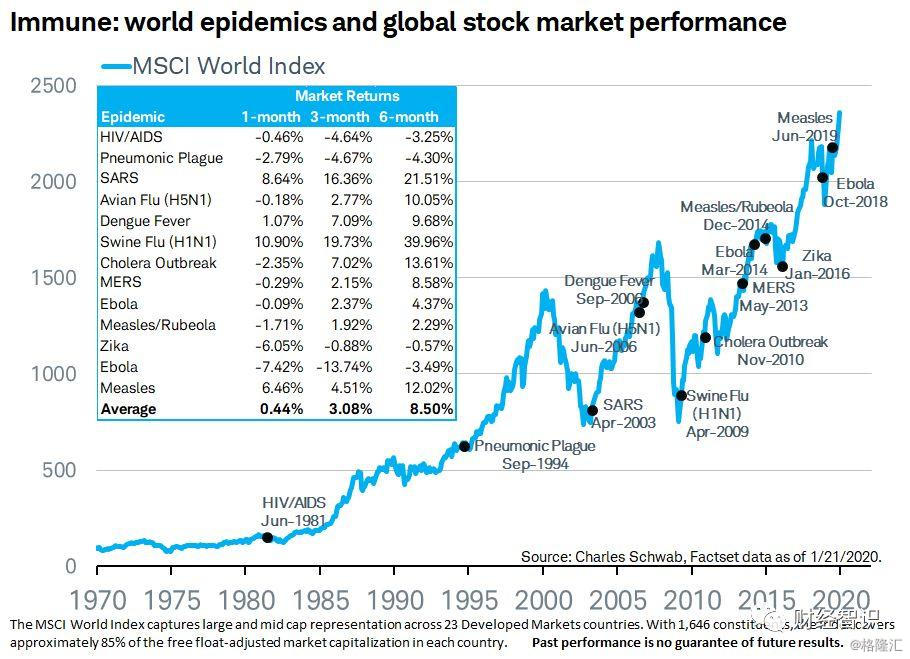 当然,这些流行性疾病对不同国家经济和股市的冲击度有大有小(例如,2013-2014年西非爆发的埃博拉病毒造成利比亚GDP下跌8个百分点),嘉信理财聚焦MSCI世界指数的分析凸显出在全球股市进行多元化配置的价值。