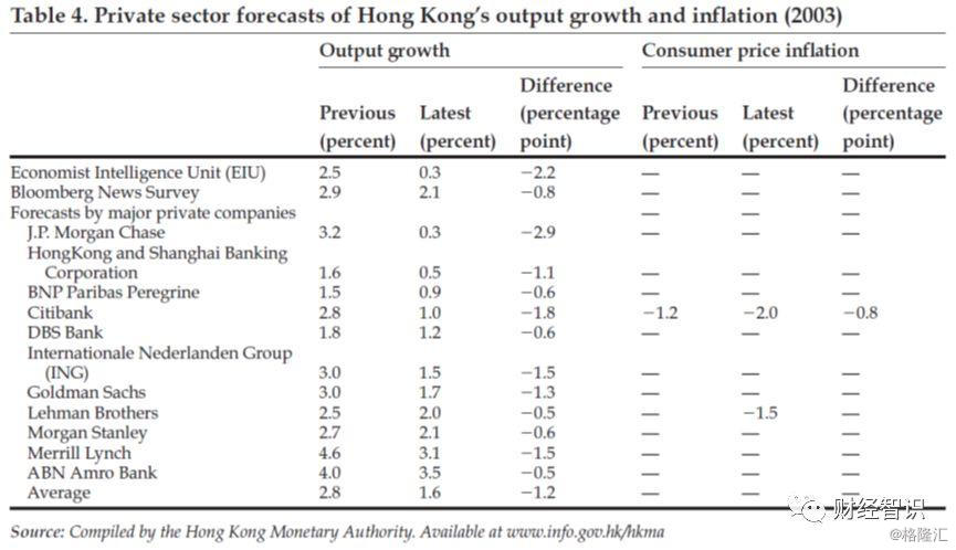 特别值得一提的是,在疫情爆发后,香港金管局收集到13家外资商业机构的预测,他们将香港GDP全年增速从平均值2.8%下调到平均值1.6%,所有预测数据均为正增长,与实际结果产生明显的偏差。这既反映了SARS疫情带来的罕见冲击难以估算,也反映出商业机构在预测上的保守性。
