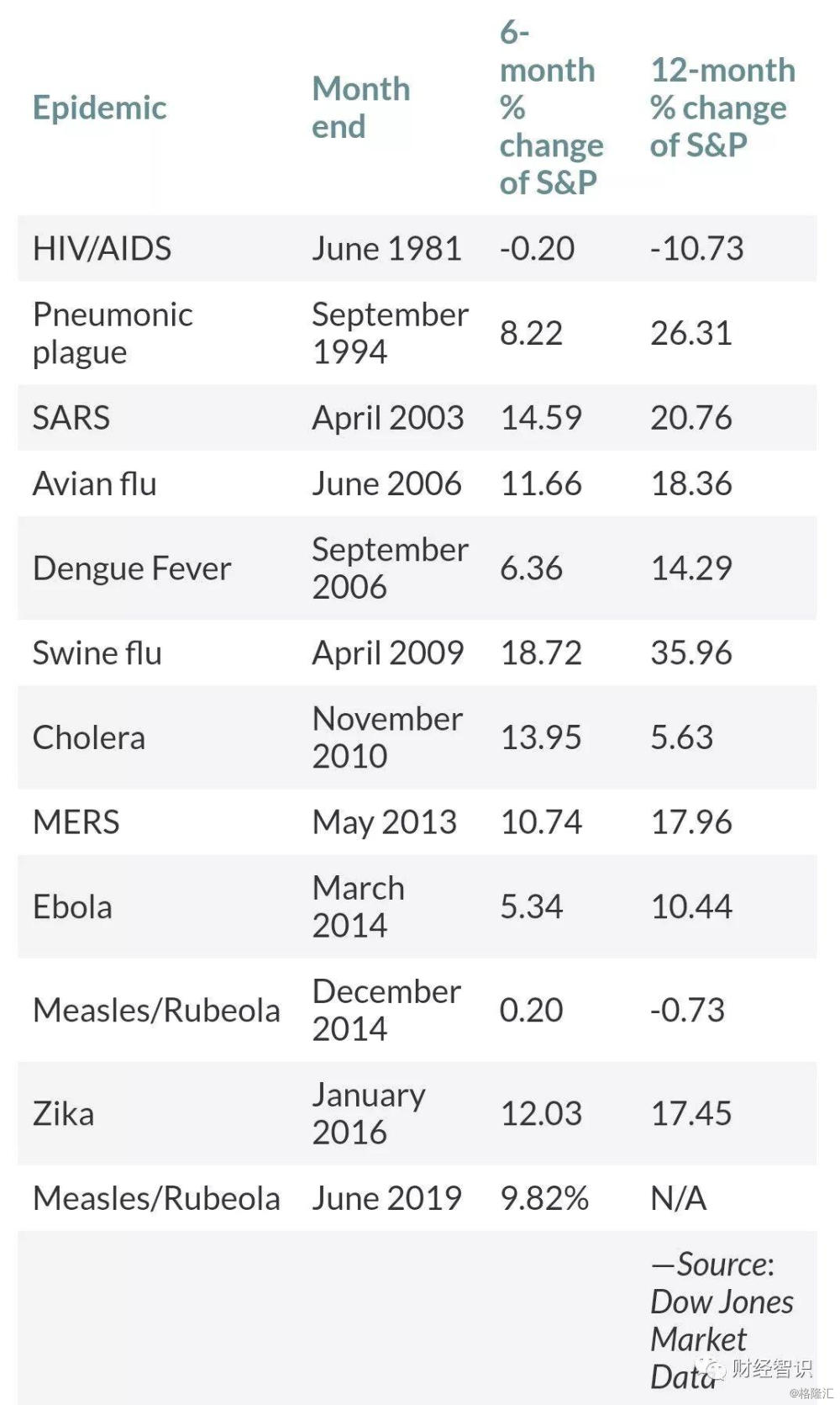 第一,MarketWatch总结了80年代以来,包括艾滋病、SARS、禽流感、MERS、埃博拉、寨卡等病毒引发的疫情在获得初步抑制后6个月和12个月的美国标普指数的表现,结果显示股市中长期表现基本不受大规模流行疾病的影响。比较巧合的是,这些疫情初步抑制后,得益于宏观经济表现和政策因素,股市大概率出现大幅上涨。