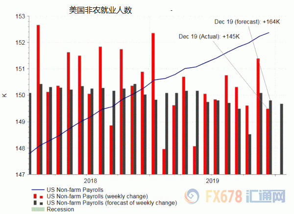 同时预计美国经济可能在2019年第4季度以年化2.1%的速度增长,与上一季度持平。2020年上半年的增长可能偏向于温和上行。但是由于波音公司暂停737 MAX的生产将持续到夏季,预计这将影响2020年第一季度的GDP增长。在就业市场上,12月非农就业人数增加了14.5万,未达到16.4万的市场预期,不过失业率保持在3.5%的历史低点。