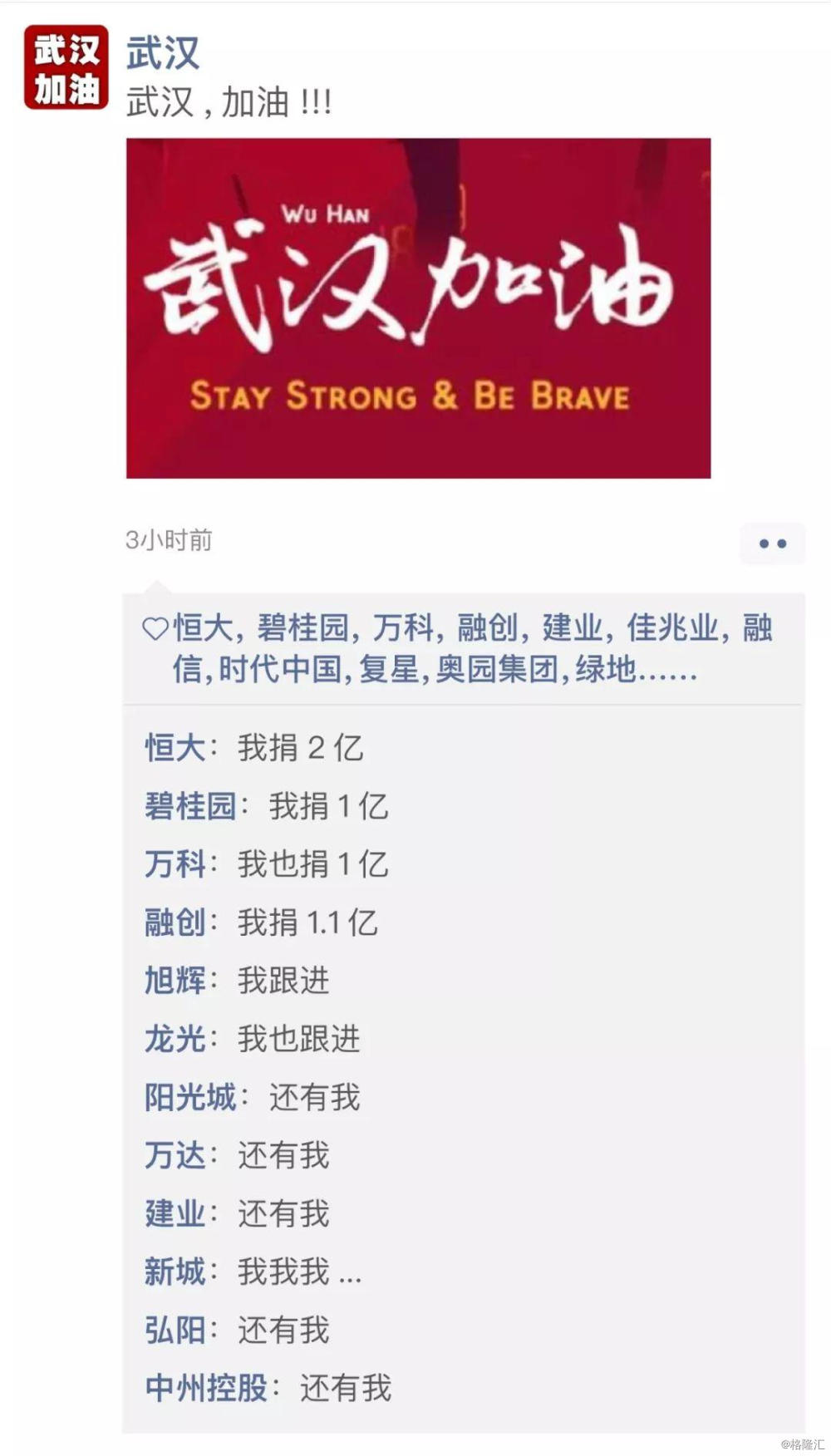 当然最后,各大房企的朋友圈这两天一定都在做一件事情,那就是为武汉的疫情共同承担一份社会力量!