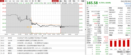 截止1月29日,3M公司股价165.58美元,跌幅5.72%。